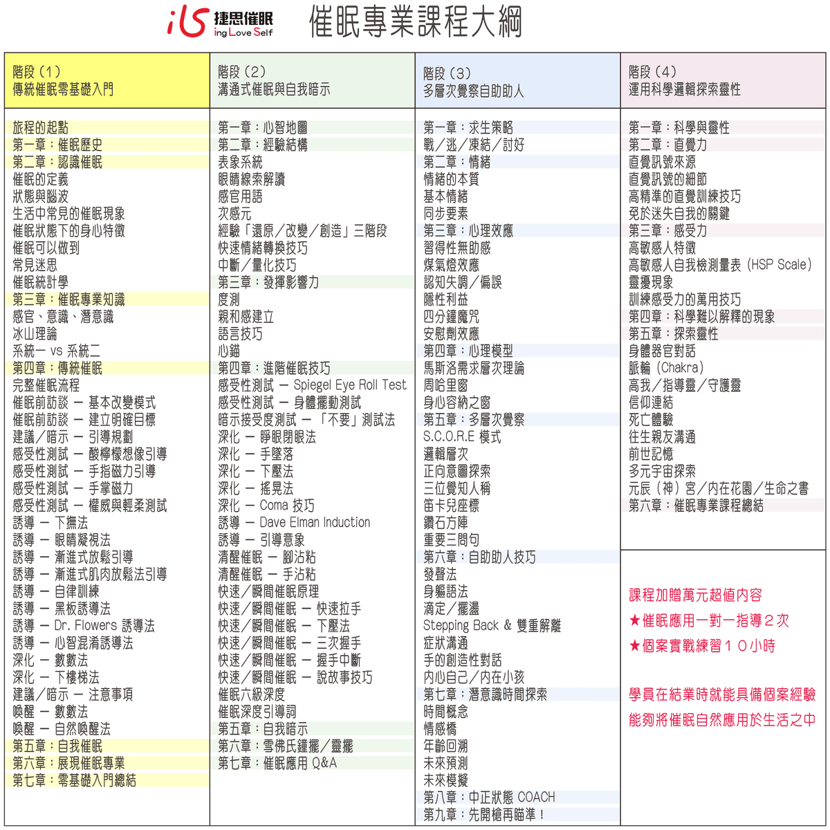捷思催眠的專業課程,以科學實證為基礎,四階段完整培訓(課程完整內容請參考下方圖片),帶領學員深入理解催眠技術,學習如何自然運用於日常與助人場域,同時培養創造力與靈活應用能力。
